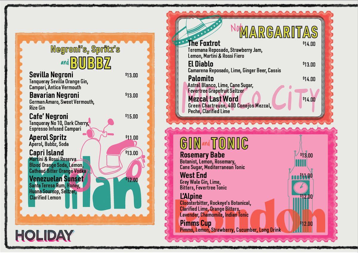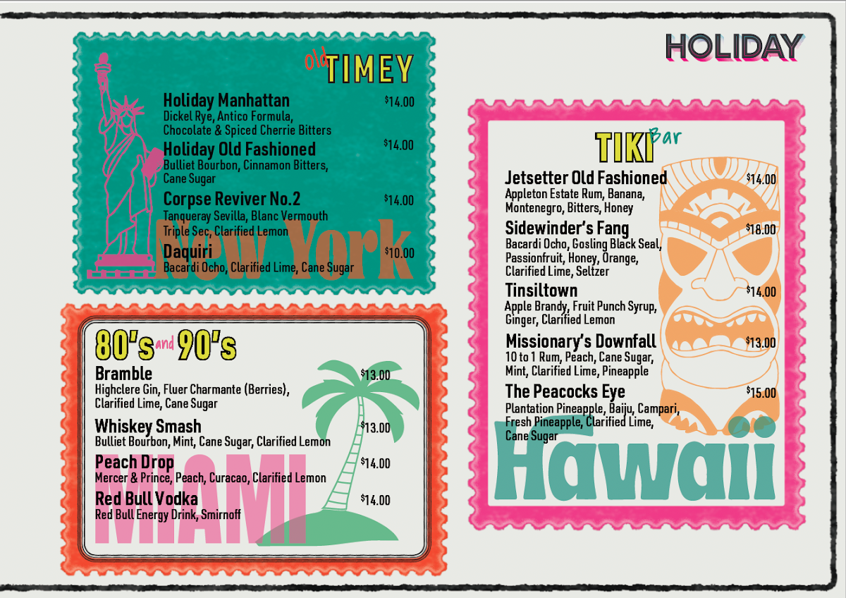 Introducing the menu at HOLIDAY, located at 1115 Howell Mill Rd NW P150 Atlanta, GA, is an experience that joyfully combines the festive spirit with an eclectic drink selection. Their coffee offerings, featuring rich espresso and vibrant matcha, set the perfect tone for the day. As the sun sets, indulge in creative cocktails like the nostalgic Old Timey drinks or refreshing Tiki Margaritas. For those seeking something non-alcoholic, HOLIDAY's mocktails and signature coffee cocktails deliver in flavor and style.